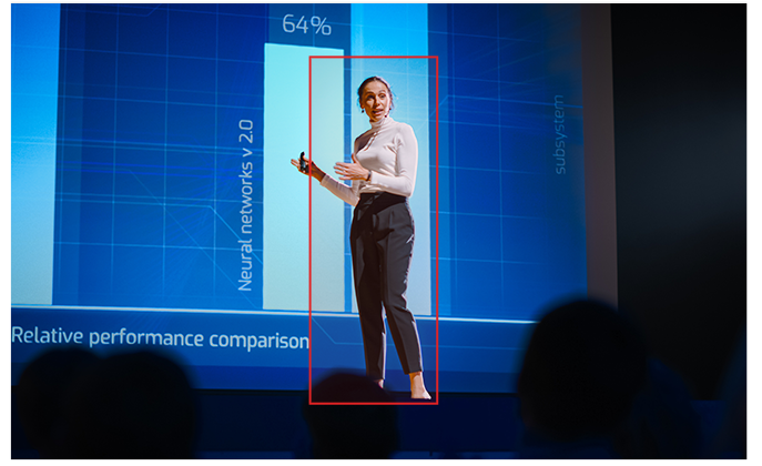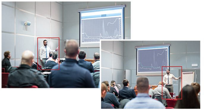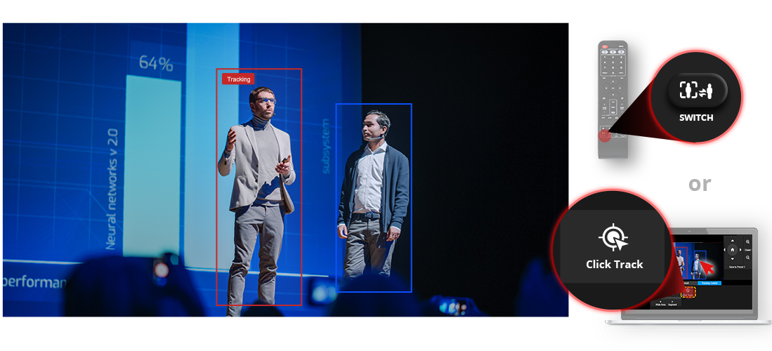 Theo dõi mục tiêu của bạn ở mọi nơi với Chế độ theo dõi người thuyết trình. Tính năng này mang đến cho người thuyết trình sự linh hoạt để rời khỏi sân khấu và tương tác với khán giả, tất cả chuyển động đều được liên tục theo dõi. Camera vẫn khóa chặt mục tiêu theo dõi, ngay cả khi những người hoặc vật thể khác cản đường.