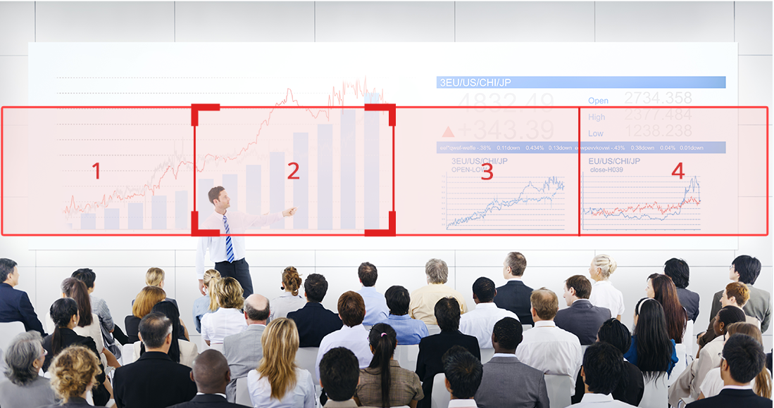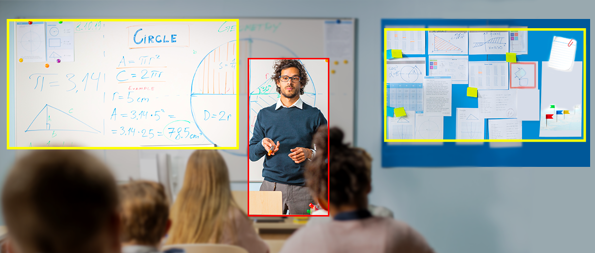 Chế độ theo dõi vùng tăng cường khả năng chụp nội dung trên nhiều màn hình. Tạo tối đa bốn Vùng Nội dung để ghi lại đều đặn nội dung được hiển thị thay vì các chuyển động của người thuyết trình.