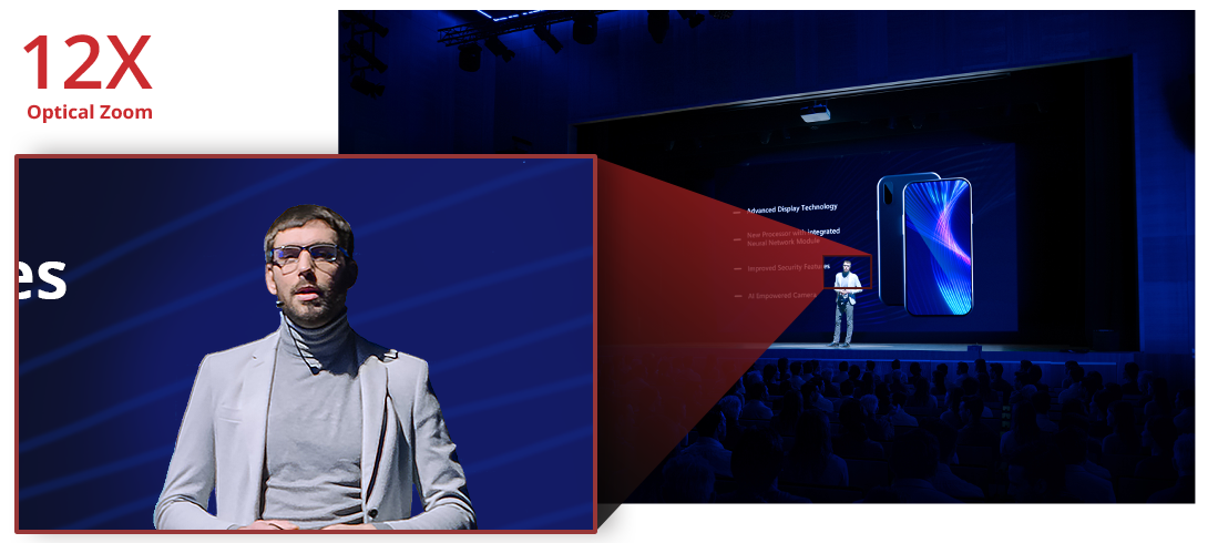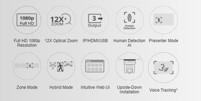 The PTC310HWV2 AI Auto Tracking PTZ Camera makes powerful and reliable Pro AV capability available to everyone. Drawing inspiration from the AVer Professional PTZ Camera family, the PTC310HWV2 features in-house AI functions like Presenter Mode, Zone Mode, and Hybrid Mode auto tracking, thanks to Human Detection processing. Combine the 12X Optical Zoom lens and Full HD 1080p resolution with hybrid auto tracking and smooth PTZ functions for broadcasting, streaming, or recording. Your exciting journey of audio and video capturing starts here!