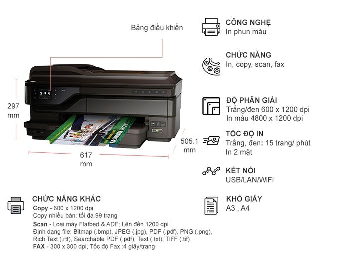 Máy in màu HP OfficeJet 7612-G1X85A trang bị kết nối USB, WiFi, LAN