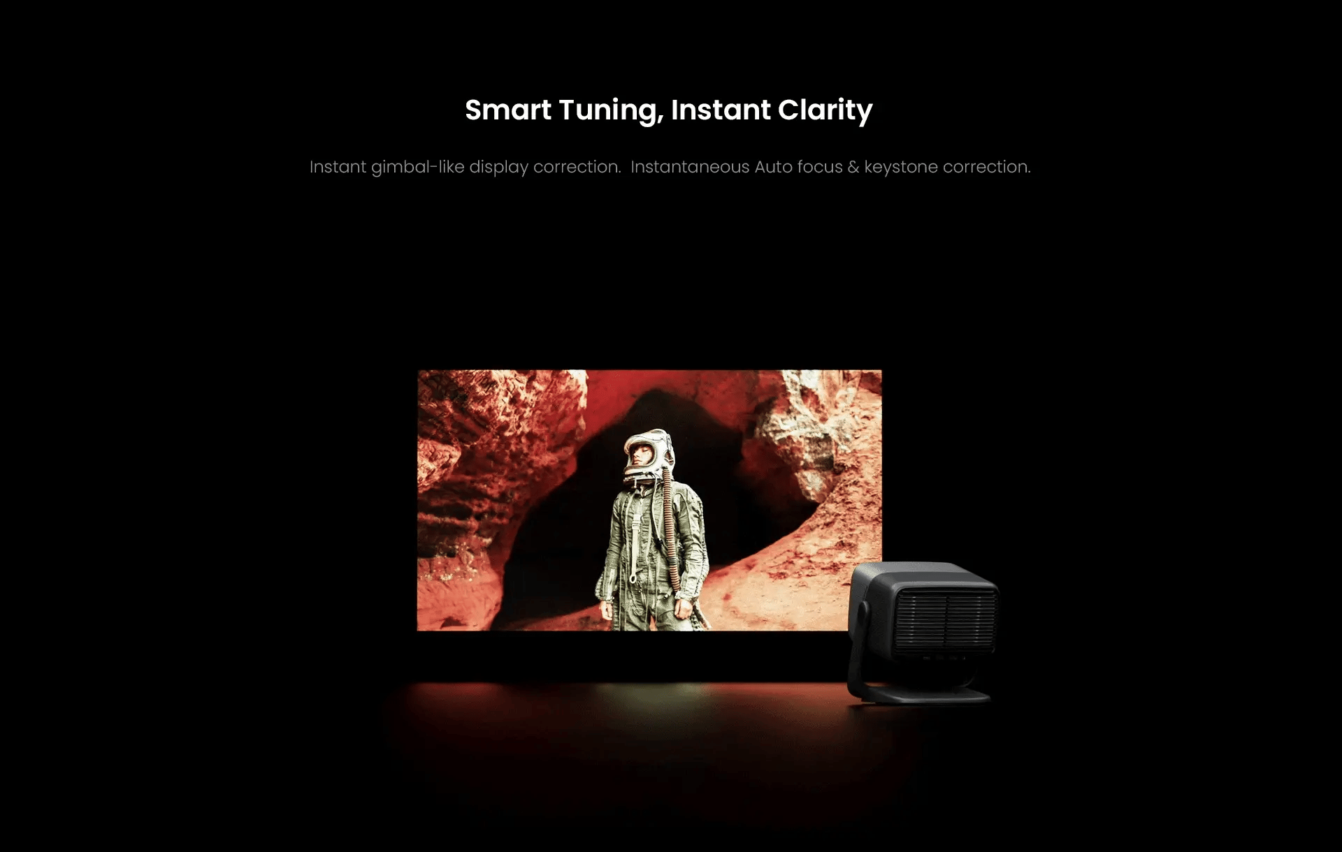 Bạn có thể để máy ở bất cứ đâu, ngay trước ống kính máy chiếu Jmgo, có các cảm biến thông minh và các tính năng do AI điều khiển như tự động lấy nét Auto Focus, cân bằng hình ảnh Auto Keystone, tránh vật thể và điều chỉnh màn hình giúp hiệu chỉnh hình ảnh của bạn chưa đến 1 giây.