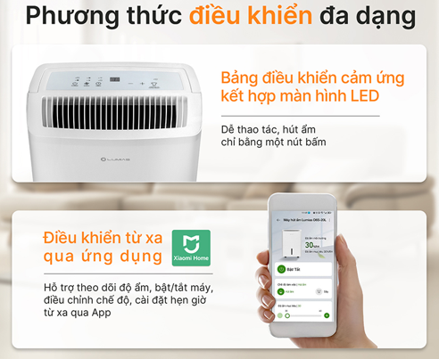 Máy hút ẩm 20L Lumias D6S-20L là lựa chọn lý tưởng cho những ai muốn giữ không gian sống luôn khô ráo và trong lành. Với khả năng hút ẩm mạnh mẽ tới 20L/ngày và phạm vi sử dụng rộng đến 50m², thiết bị dễ dàng đáp ứng cho cả phòng ngủ, phòng khách hay văn phòng. Máy hoạt động êm ái chỉ 37dB cùng bộ lọc ion bạc khử khuẩn giúp bảo vệ sức khỏe, cùng với đó là tính năng điều khiển thông minh qua ứng dụng MiHome mang lại sự tiện lợi tối đa cho người dùng bận rộn. Máy hút ẩm Lumias D6S-20L luôn là giải pháp toàn diện giúp bạn chủ động kiểm soát chất lượng không khí và tận hưởng cuộc sống thoải mái hơn mỗi ngày.