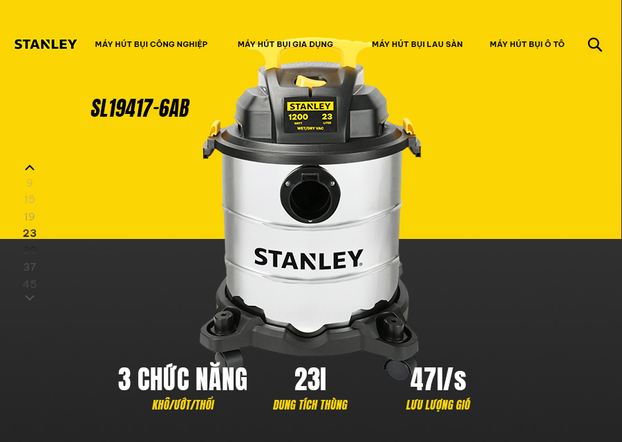 Model: SL19417-6ABThương hiệu: StanleyDung tích: 23 lítKhối lượng (gross): 7.5 (kg)Công suất lực hút: 16Kpa – 19KpaLưu lượng: 47-57L/sCấu tạo: Thép không rỉHiệu điện thế/tần số: 220V/50HzChiều dài dây điện: 3.05 métKích thước ống hút: 3.2 (cm) x 1.8 (m)Kích thước thùng carton: 51.8 x 38.4 x 38.3 (cm)
