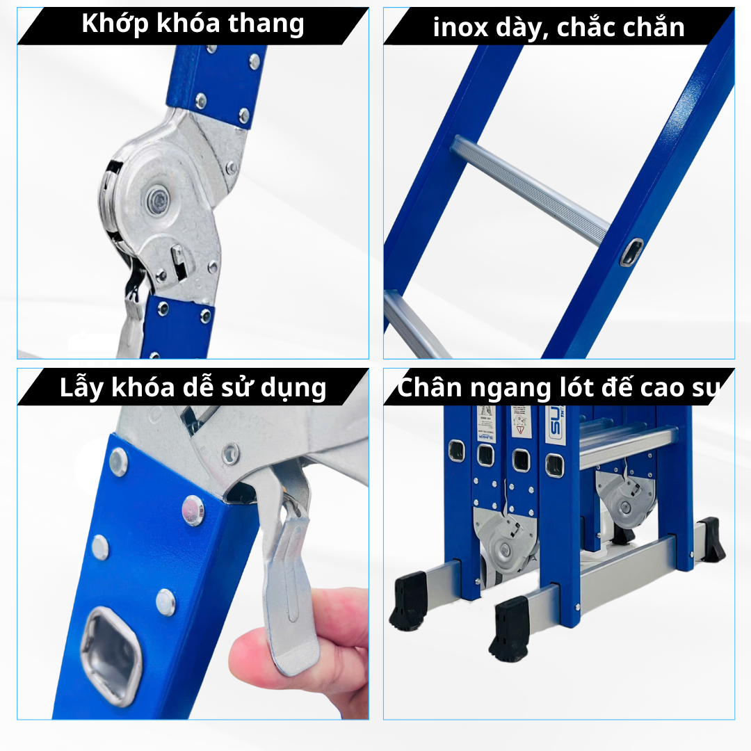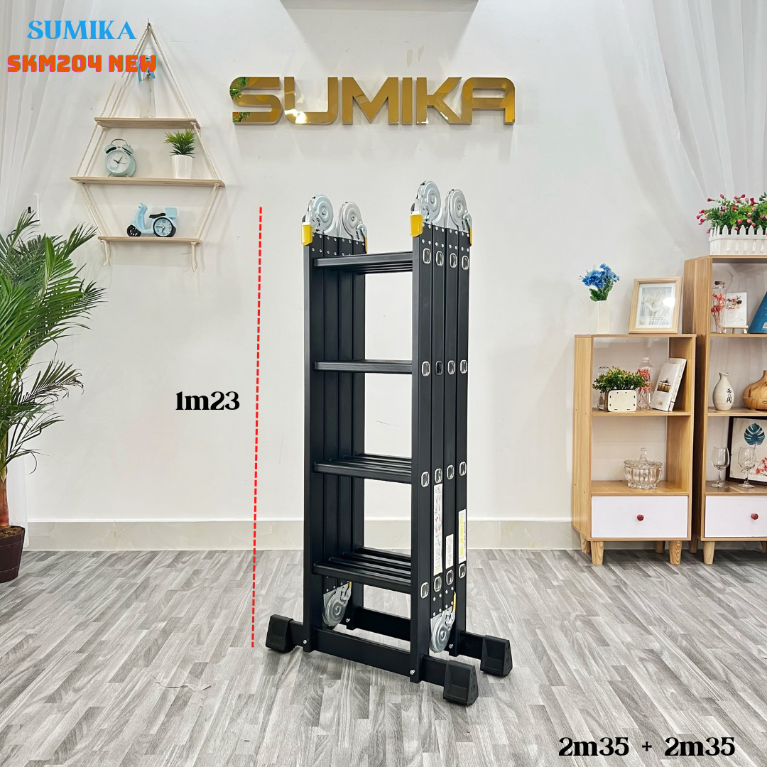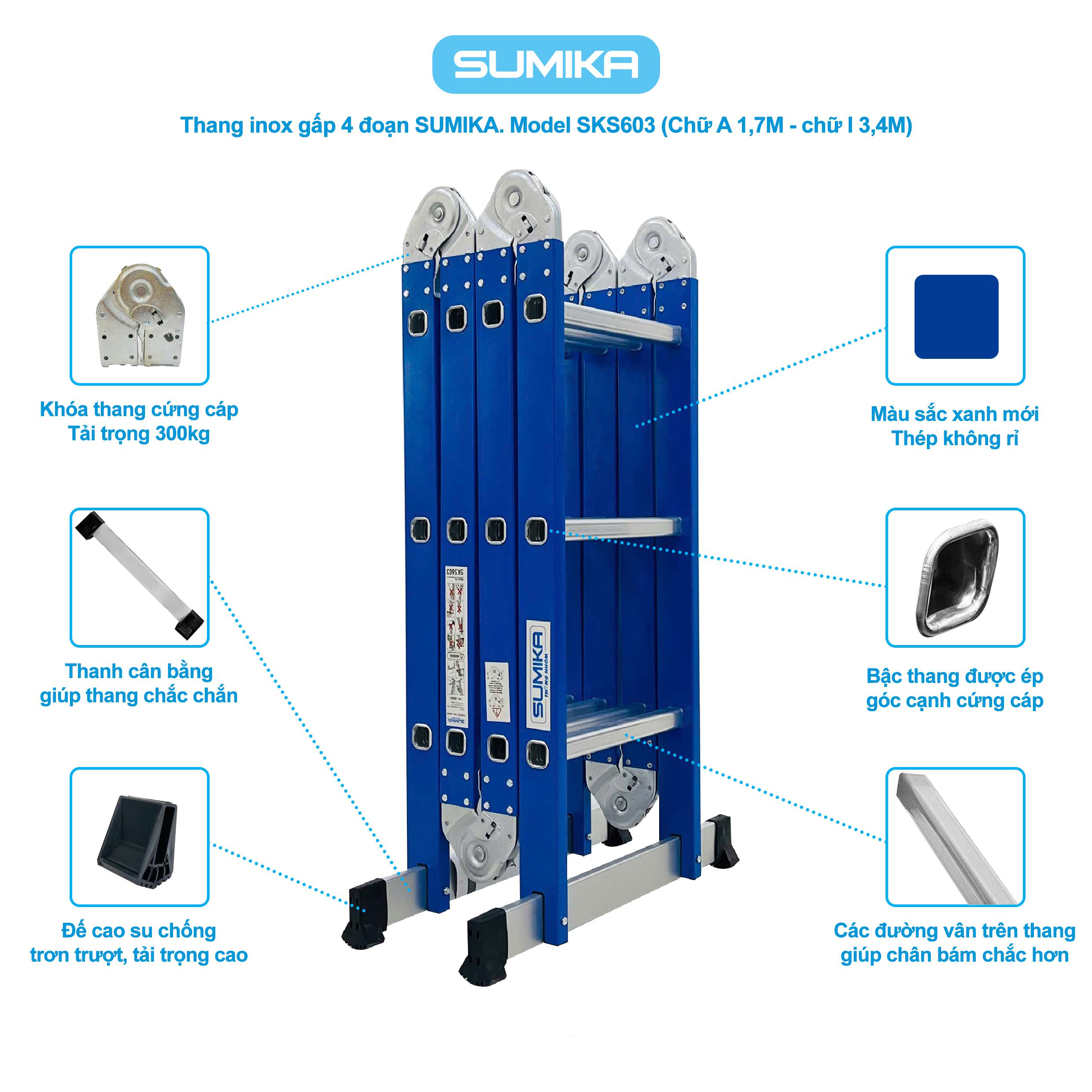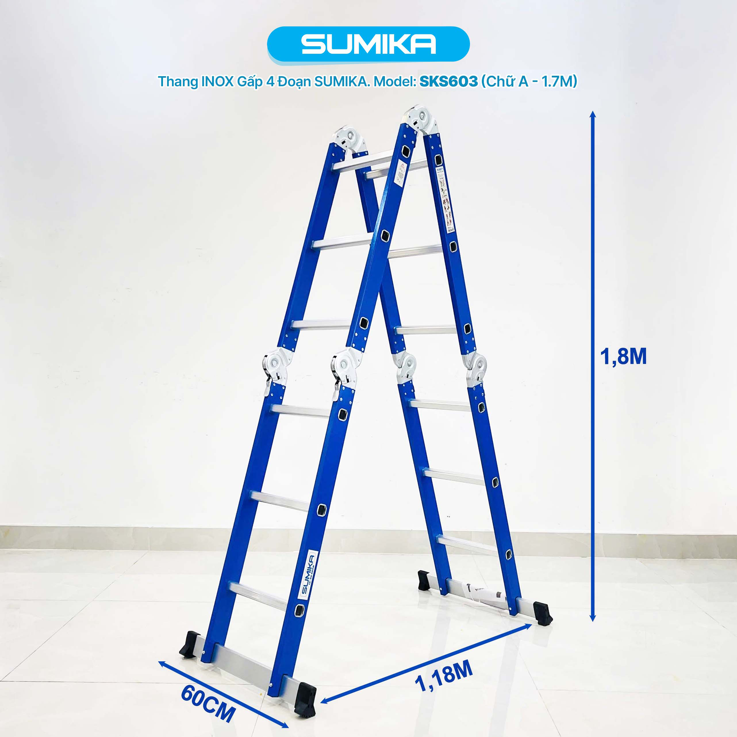 Thang inox gấp 4 đoạn Sumika SKS603, chữ A cao 1.7m, chữ I cao 3.4mSố bậc: 3x4Kích thước đóng gói: 93x35x26cmChiều cao tối đa chữ A: 1.7mChiều cao tối đa duỗi thẳng chữ I: 3.4mChất liệu: Inox cao cấpTrọng lượng: 13kgKhoảng cách giữa các bậc : 28cmThanh ngang: 63cmTải trọng: 300kgXuất xứ: ChinaBảo hành : 12 tháng