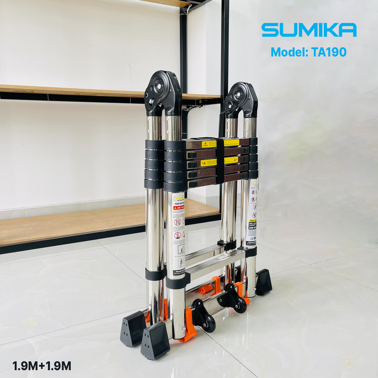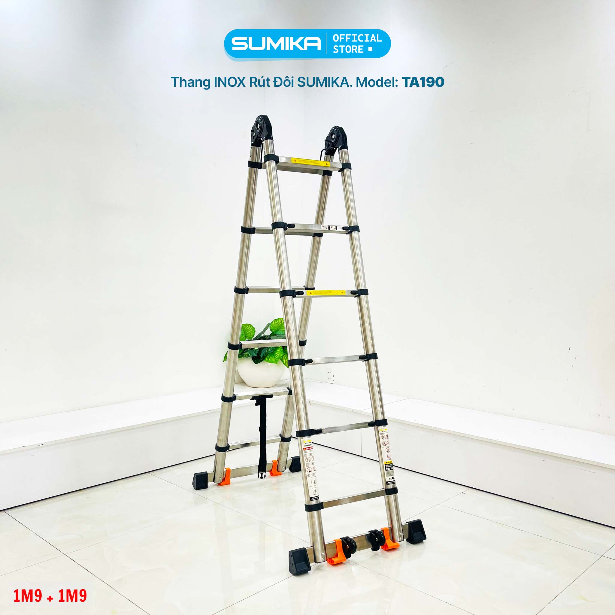 Thang inox rút đôi Sumika TA190 chiều cao 1.9m+1.9mKích thước: 86x48x14cmChiều cao tối đa chữ A: 1.9mChiều cao tối đa chữ I: 3.8mChiều cao rút gọn chữ A: 0.85mTrọng lượng: 17.3kgSố bậc: 2x6 bậcĐộ dày inox: 1mmTải trọng 300kg.Đạt tiêu chuẩn EN131.Bảo hành : 12 thángXuất xứ: China