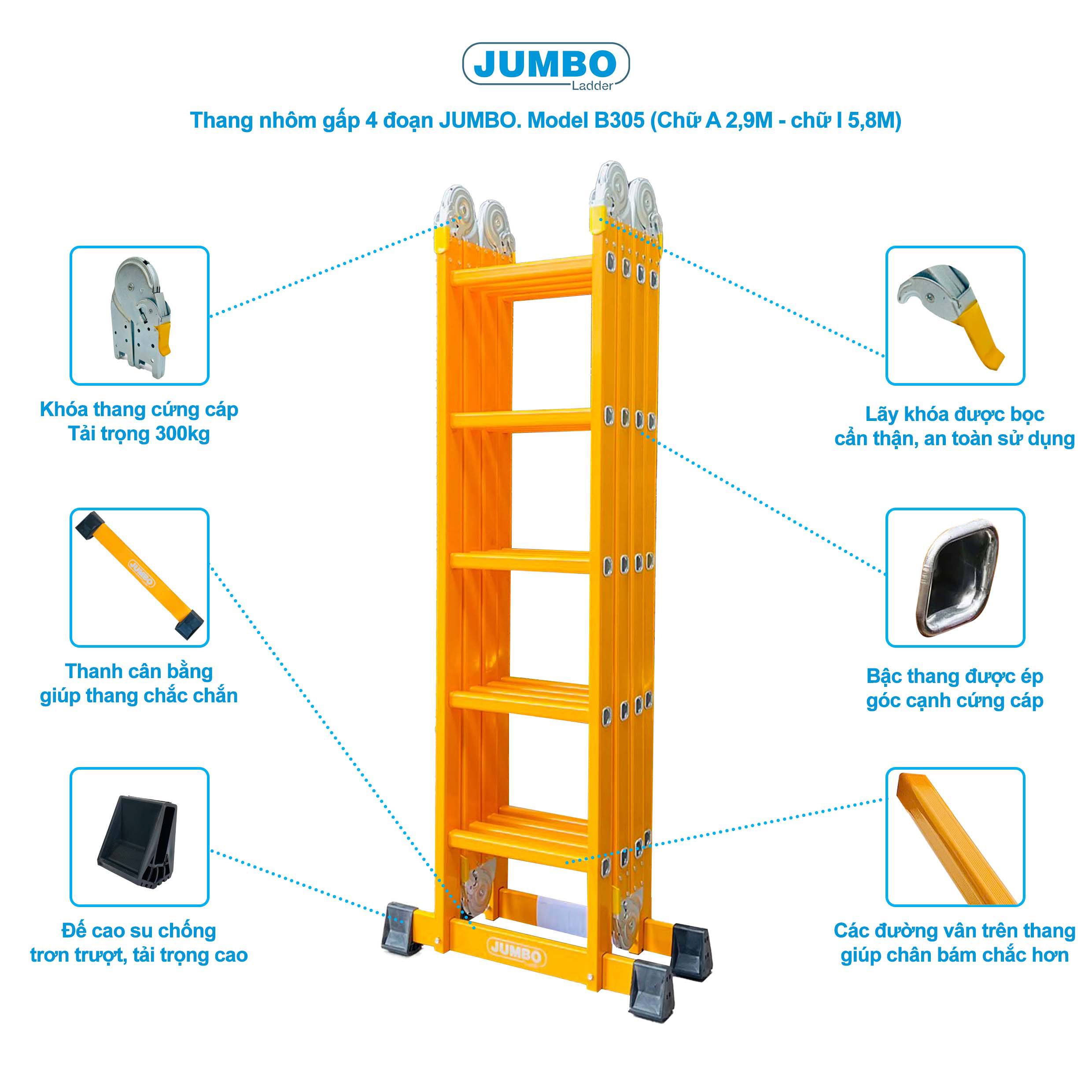 Thang nhôm gấp 4 đoạn JUMBO B305, chữ A cao 2.9mKích thước đóng gói : 156x62x26cmChiều cao tối đa chữ A : 2.8mChiều cao tối đa duỗi thẳng chữ I: 5.7mĐộ dày nhôm: 1.7mm.Trọng lượng: 15.3kgSố bậc: 4x5 bậcKhoảng cách giữa các bậc: 28cmChất liệu: Hợp kim nhôm được sơn tĩnh điện.Tải trọng: 300kgTiêu chuẩn châu âu EN131, EN14183, CE.Bảo Hành : 12 thángXuất xứ : China