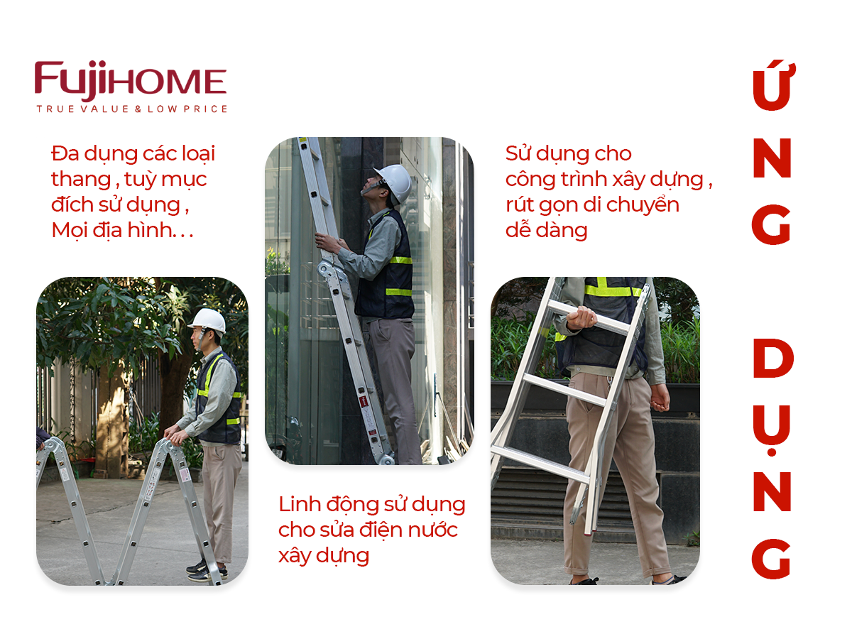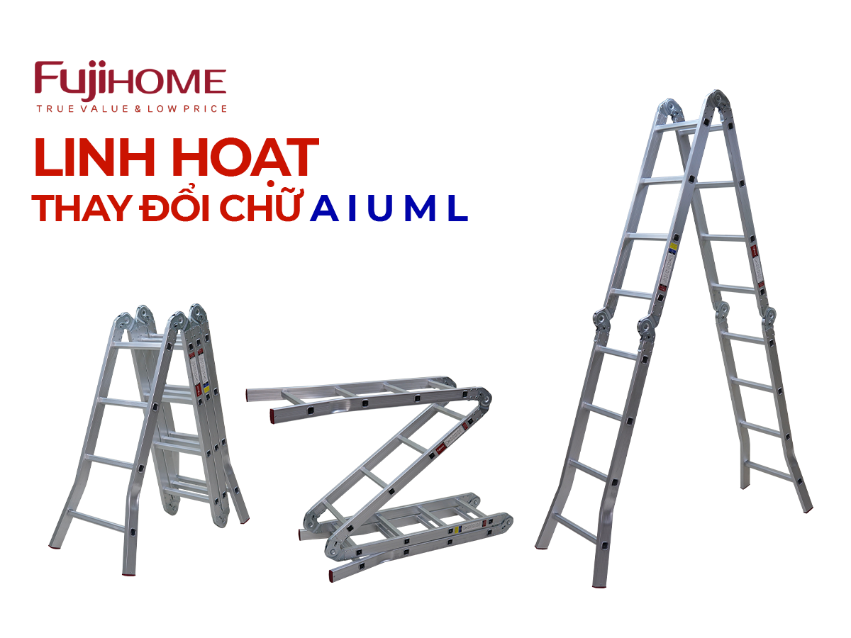 Thang nhôm gấp đa năng 4 đoạn FUJIHOME ML104S thuộc dòng thang nhôm gấp đa năng là loại thang nhôm có tính di động cao, linh hoạt trong thiết kế cũng như mục đích sử dụng. Đây là loại thang được dùng phổ biến trong các doanh nghiệp cũng như công trường xây dựng, ngành điện lực, viễn thông, ngành điện lực, lắp đặt cáp quang, lắp đặt internet, thợ chuyên sửa chữa lắp đặt điều hòa...