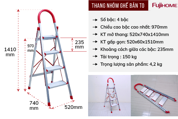 Kích thước khi mở thang : 520(ngang bậc)x740(dài)x1410(cao) mm
