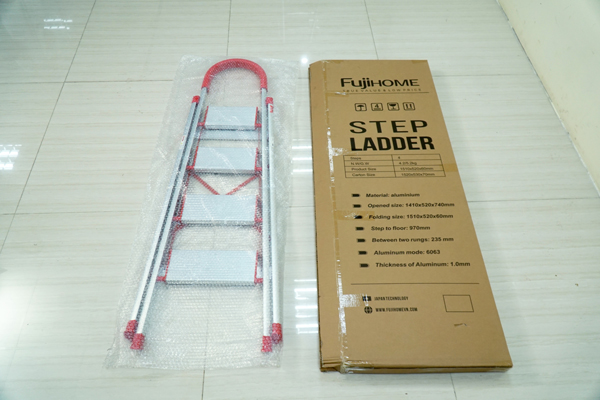 Thang ghế 4 bậc FUJIHOME SL-304 có vỏ thùng carton đựng thang cẩn thận, hạn chế bị trầy xước khi di chuyển, cũng như có tem nhãn mác không như các thang trôi nổi trên thị trường hiện nay.