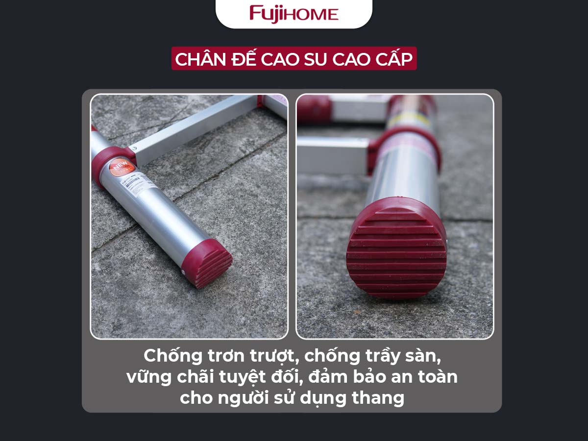 Chân thang được bọc nhựa chống trơn trượt thật cẩn thận, nút nhựa được thiết kế vòng cung kèm với các vân sần giúp cho chân thang khi tiếp xúc bề mặt đất tăng thêm độ bám, độ ma sát cao chống trượt
