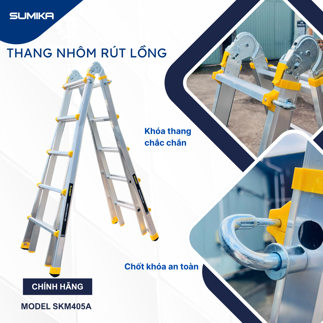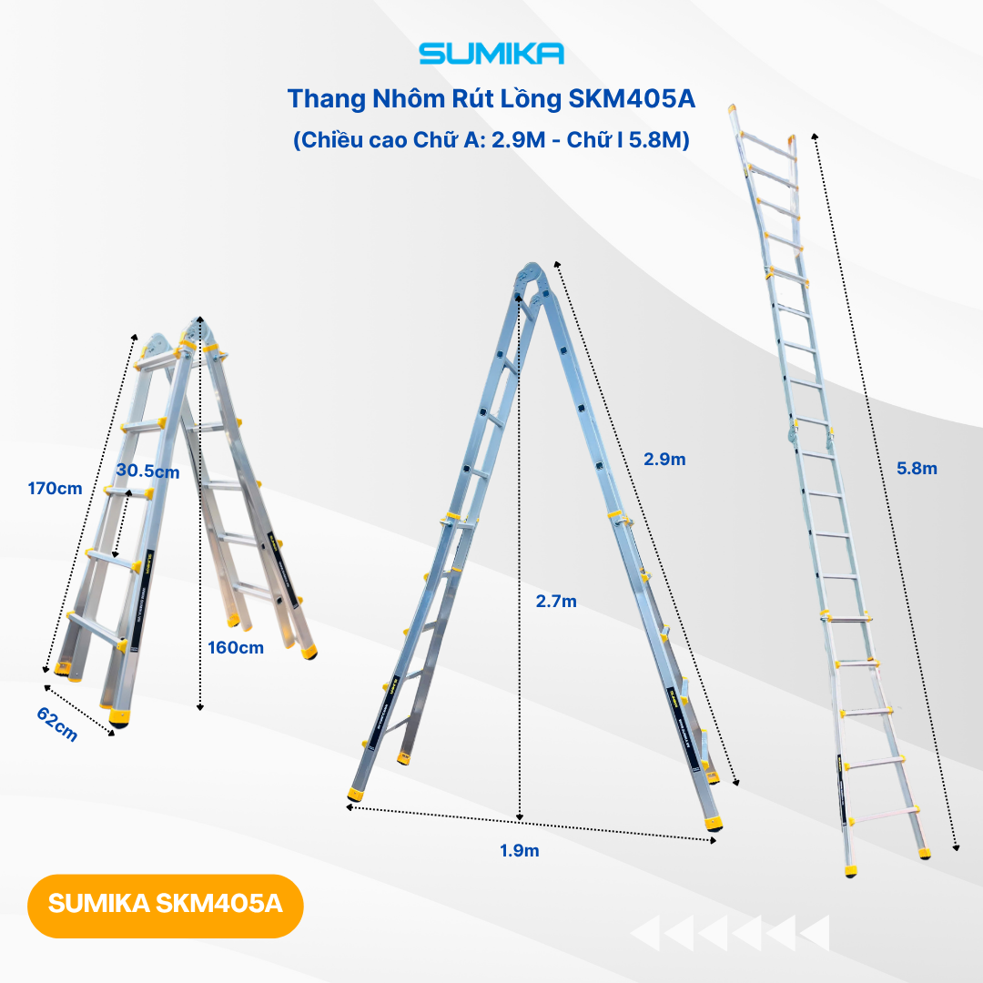 Thang nhôm rút lồng SUMIKA SKM405A,chữ A cao nhất 2.9mSố bậc: 2x9 (đã có bậc rút)Chiều cao chữ A thấp nhất: 1.7mChiều cao A cao nhất: 2.9mChiều cao chữ I cao nhất: 5.8mKích thước đóng gói: 170x65x20cmTrọng lượng thang: 12.2kgTải trọng thang: 300kgXuất xứ: ChinaBảo hành : 12 tháng